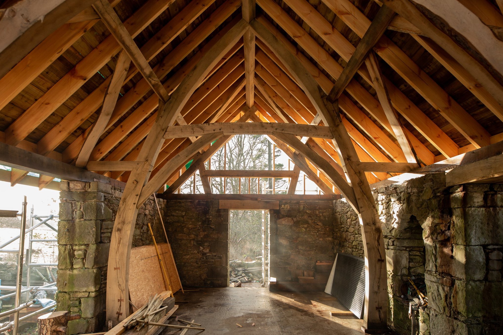 We use traditional timber framing in all of our designs, creating truly unique structures by skillfully harnessing the natural shapes and characteristics of wood. Our commitment to quality extends to prioritising the sourcing of local wood, ensuring sustainability and support for local communities. Additionally, we often mill the timber ourselves, allowing us to maintain a high standard throughout the entire building process.